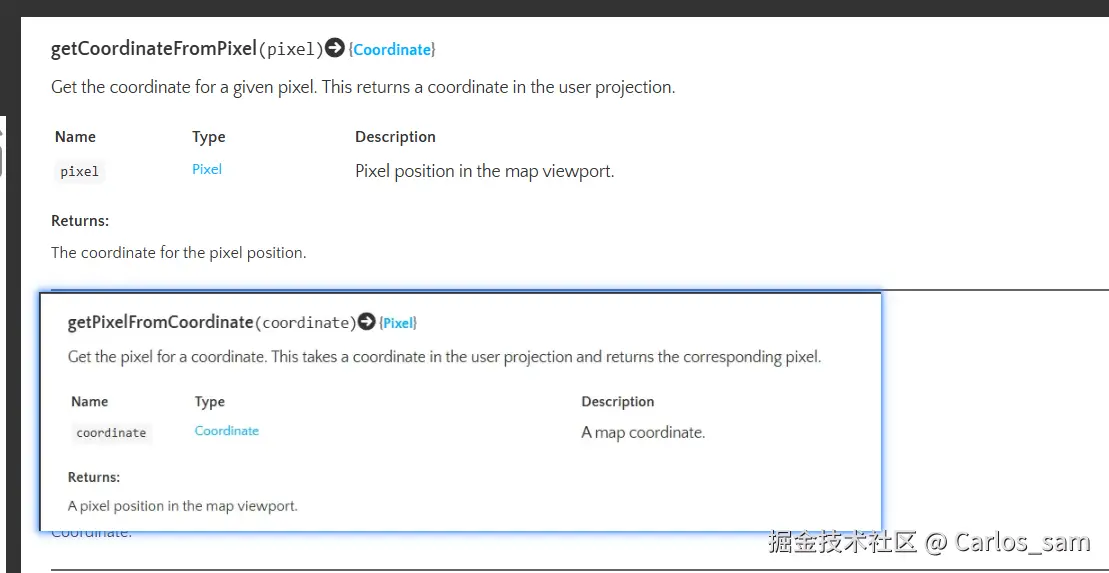 view.getPixelFromCoordinate(coordinate) // 空间坐标 => 屏幕坐标