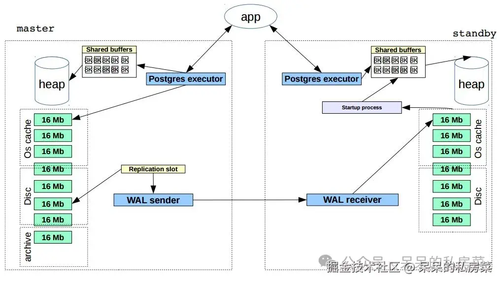 - 从服务器通过wal receiver进程接收来自主库的wal日志;