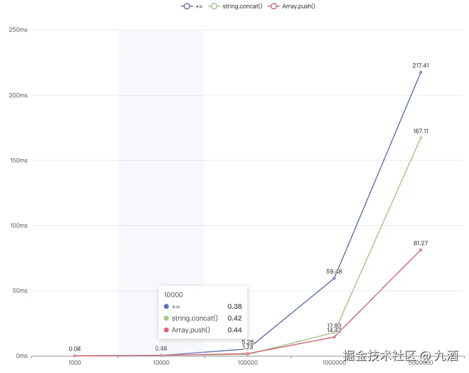 根据以上三种方式,分别对1千、1万、10万、100万、500万的字符在chrome中独立进行拼接耗时检测
