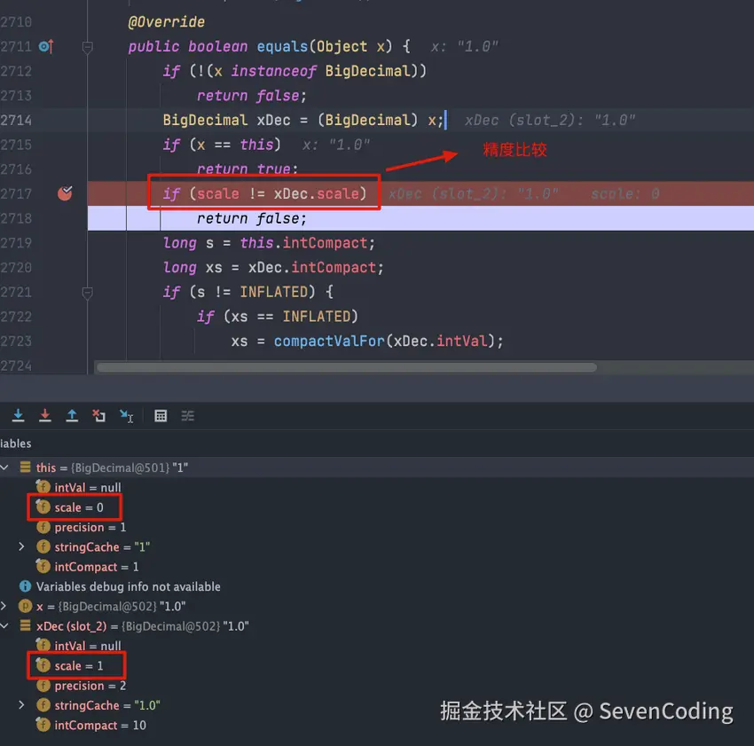 这是因为BigDecimal的 equals() 方法不仅仅会比较值的大小(value)还会比较精度(scale),而 compareTo() 方法比较的时候会忽略精度。