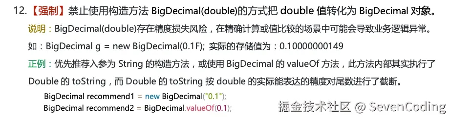 《阿里巴巴 Java 开发手册》中提到:“浮点数之间的等值判断,基本数据类型不能用 == 来比较,包装数据类型不能用 equals 来判断”。“为了避免精度丢失,可以使用 BigDecimal 来进行浮点数的运算”。