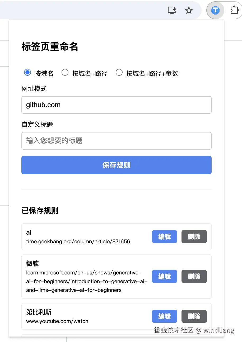 主要功能:匹配用户输入的网站地址,设置当前网站为用户设置的标题。 三种选择供用户选择: