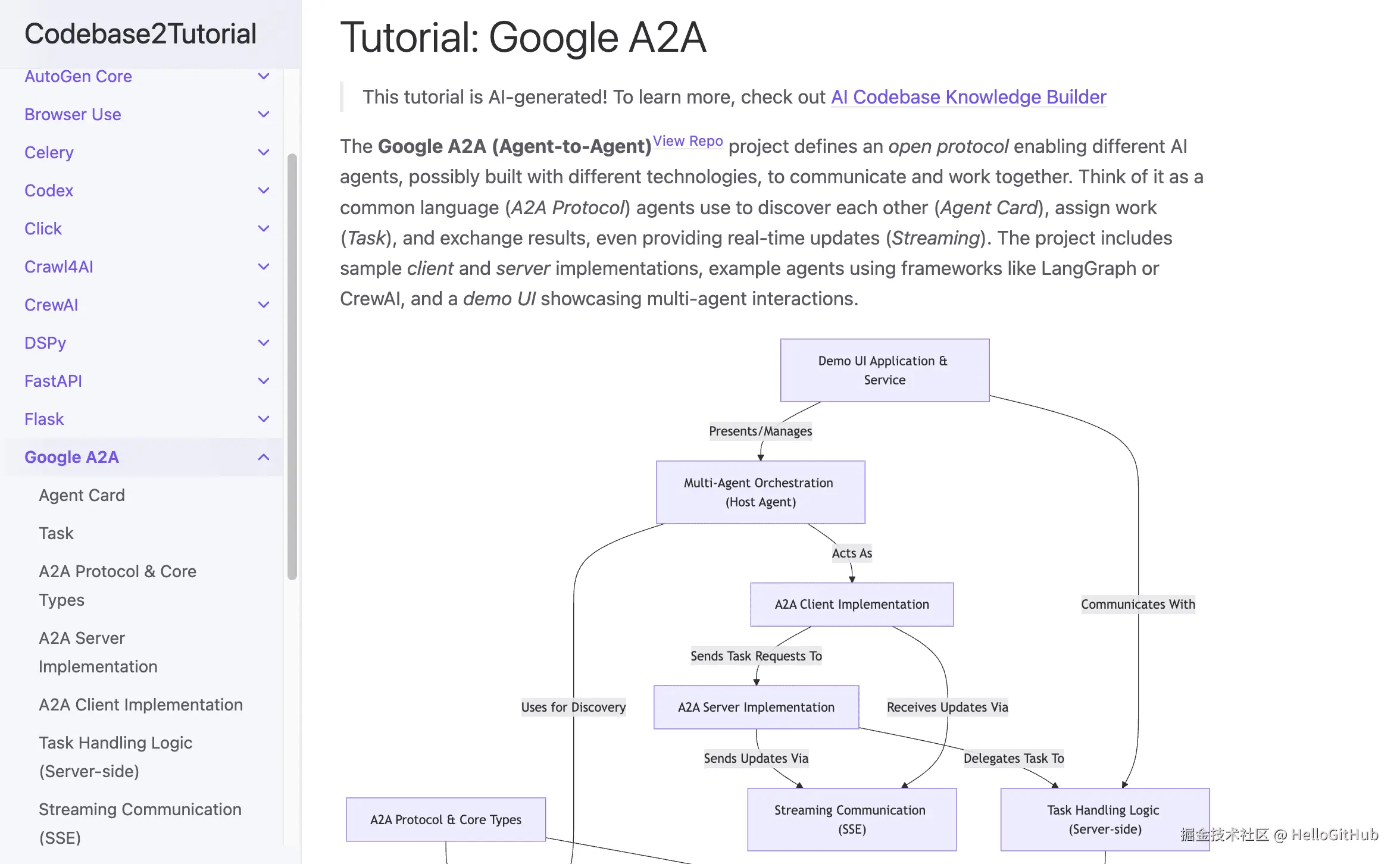 34、Tutorial-Codebase-Knowledge:AI 自动生成代码库教程。该项目利用 AI 将代码库转换为容易理解的教程。它通过分析 GitHub 仓库或本地代码目录,自动生成详细的学习指南,降低初学者理解和上手大型代码仓库的门槛。