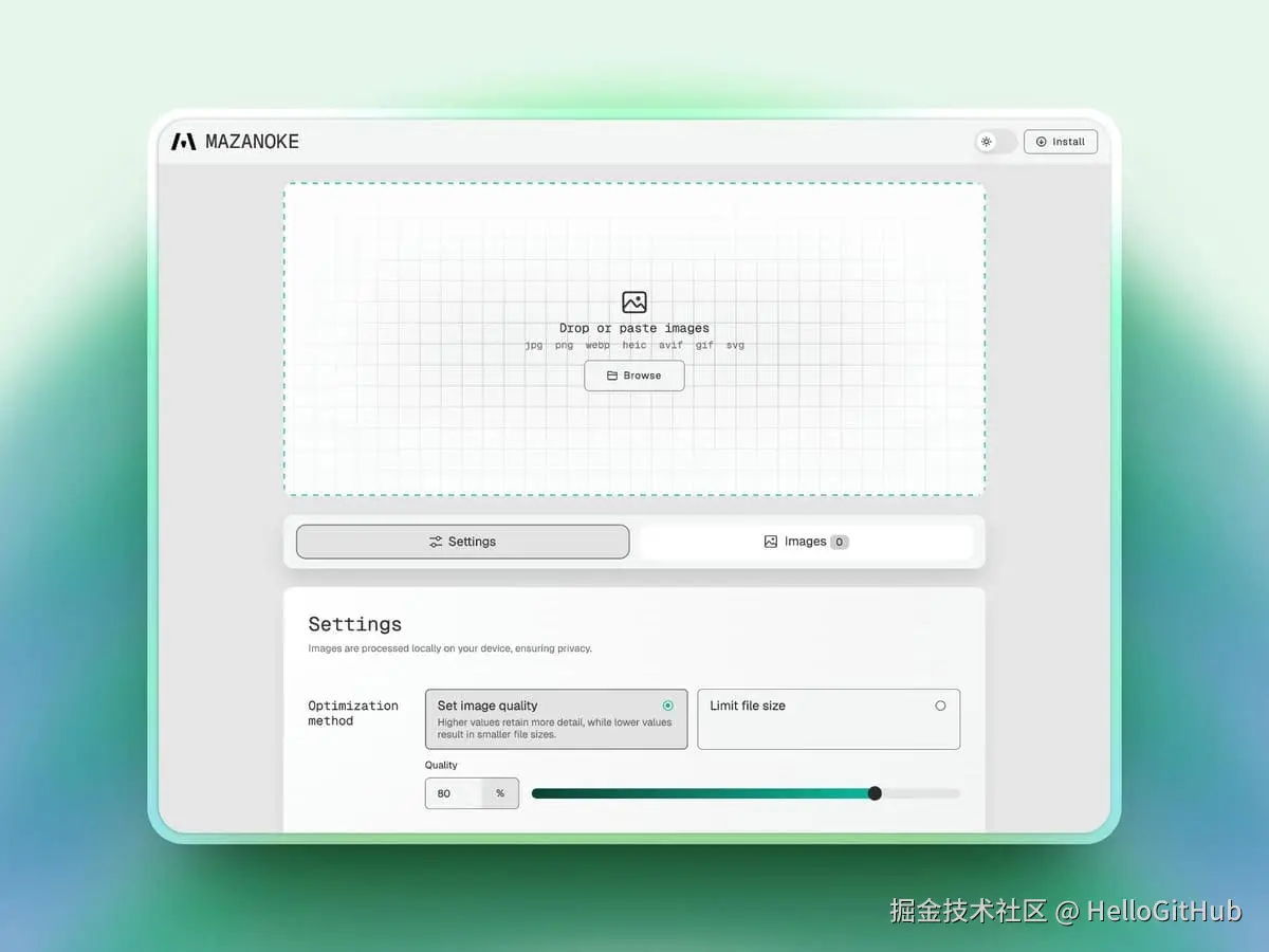 16、mazanoke:本地优先的图片压缩工具。这是一款注重隐私保护的浏览器端图片优化工具,无需联网可离线使用。它部署简单、功能丰富,提供图片压缩、格式转换和批量上传等功能,兼容 JPG、PNG、WebP、HEIC、AVIF、GIF、SVG 等图片格式。