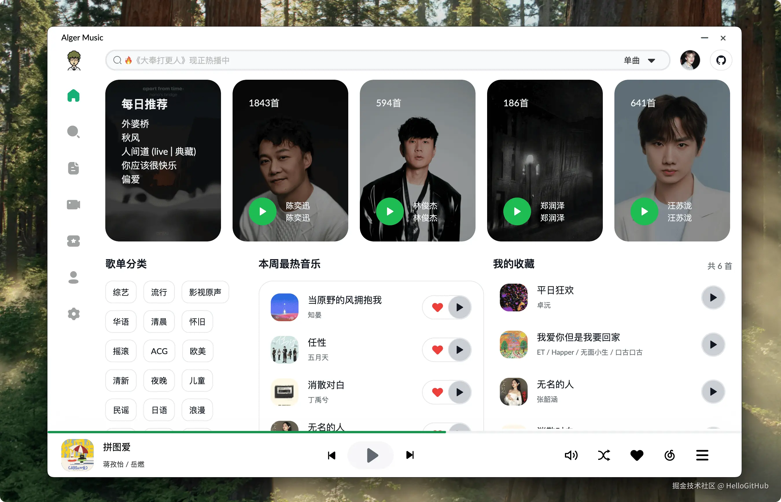 14、AlgerMusicPlayer:简约美观的音乐播放器。这是一款基于 Electron 开发的第三方音乐播放器,拥有高颜值的界面和丰富的功能,支持本地化服务、桌面歌词显示、音乐下载等,适用于多平台使用。