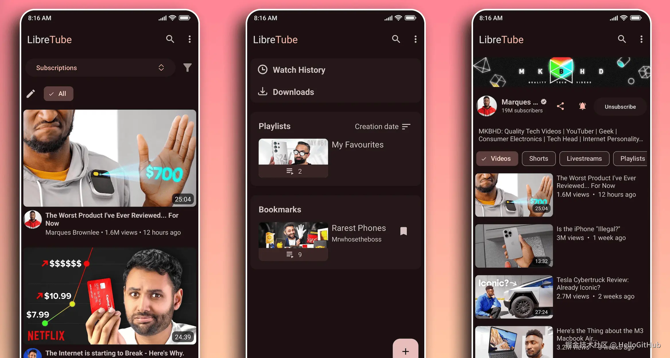 19、LibreTube:开源的油管 Android 客户端。这是一款开源的第三方 YouTube 安卓客户端,提供纯净的视频观看体验。它无需登录 Google 账号、无广告干扰,支持订阅、播放列表、观看历史、搜索历史等功能。