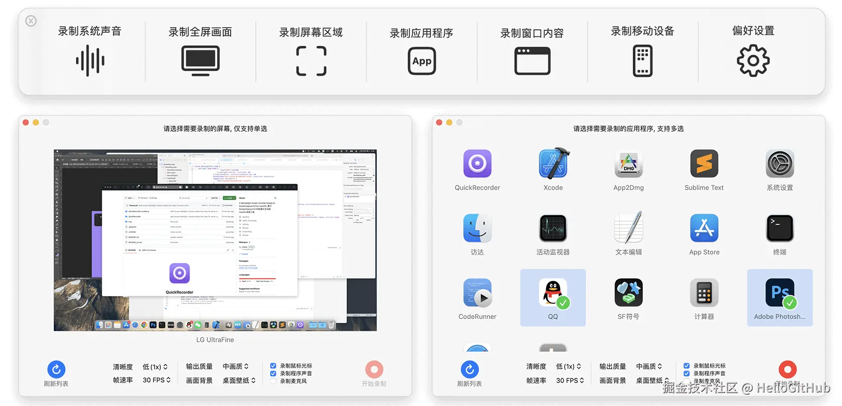 30、QuickRecorder:轻巧的 macOS 屏幕录制工具。这是一个用 SwiftUI 编写、仅 10MB 的 macOS 屏幕录制工具,它只为做好录屏这一件事,不仅免费且功能丰富,支持窗口录制、应用录制、录制移动设备、窗口声音内录、鼠标高亮、隐藏桌面文件等功能。