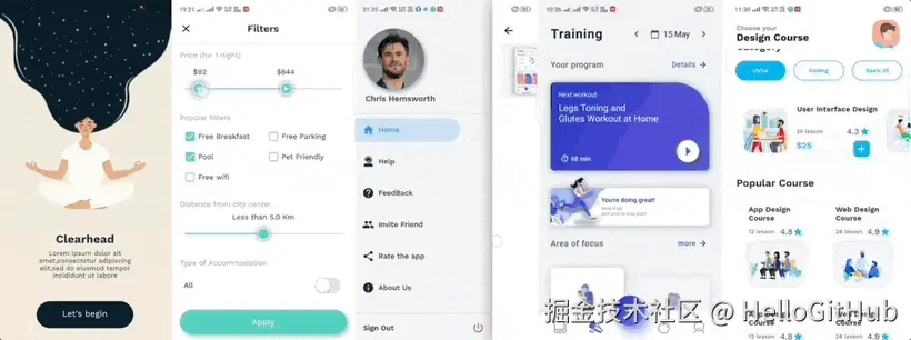 36、Best-Flutter-UI-Templates:免费精美的 Flutter UI 模板集合。该项目是完全免费的 Flutter UI 模板集合,为开发者提供高质量的界面设计参考和代码实现,包含引导页、酒店预订、健身应用等多种应用的 Flutter 界面模板。