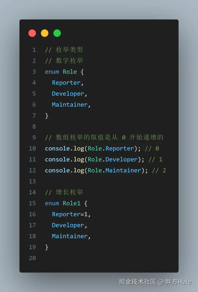 在 JS 中是没有枚举这个概念的,TS 帮我们定义了枚举类型,通过关键字 enum 定义。