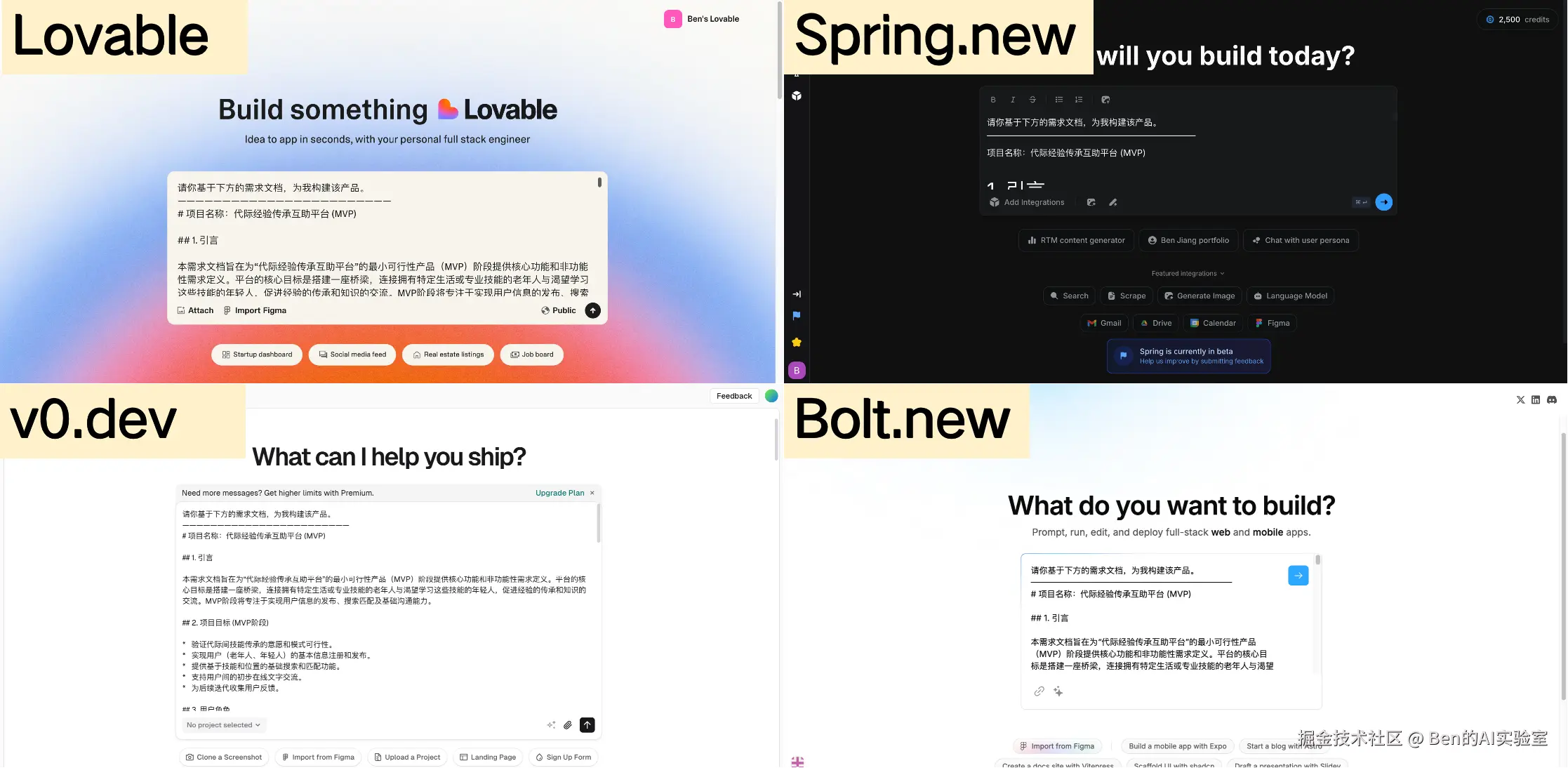 热门产品:v0.dev, Lovable, Spring.new, Bolt.new 等。这些工具均为国外开发,界面为英文。