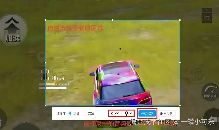 步骤2:自由框选需要录制的游戏区域,选择需要录制的音频源后,就可以点击 “开始录制” 按钮录制视频了。