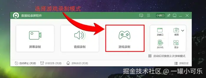 步骤1:电脑打游戏怎么录屏?打开数据 蛙录屏软件,在主页面找到录制模式选项,需要录制游戏的话,我们就点击选择 “游戏录制” 模式。