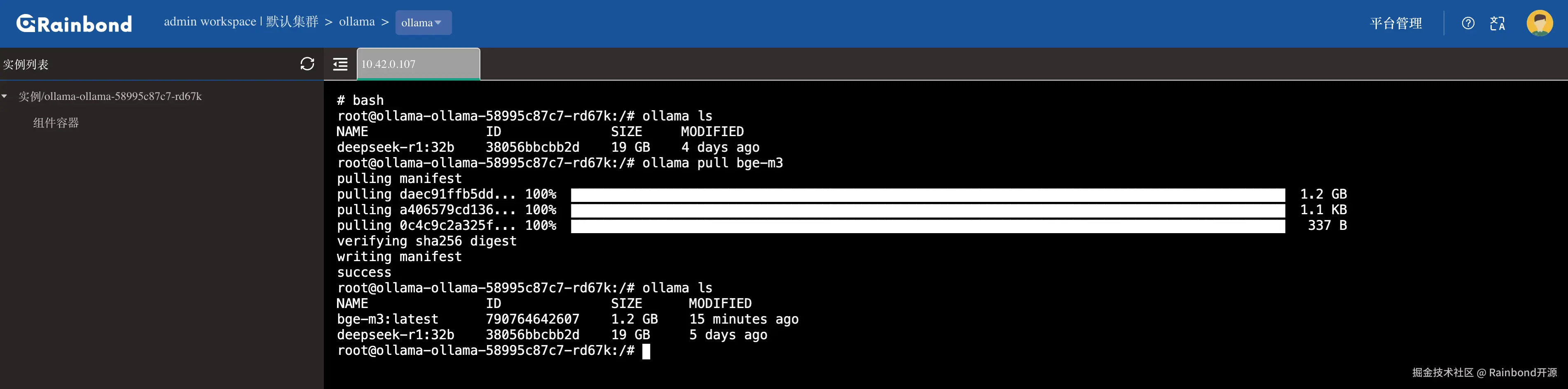 进入 Rainbond 的 Ollama 组件内,进入 Web 终端执行如下命令: