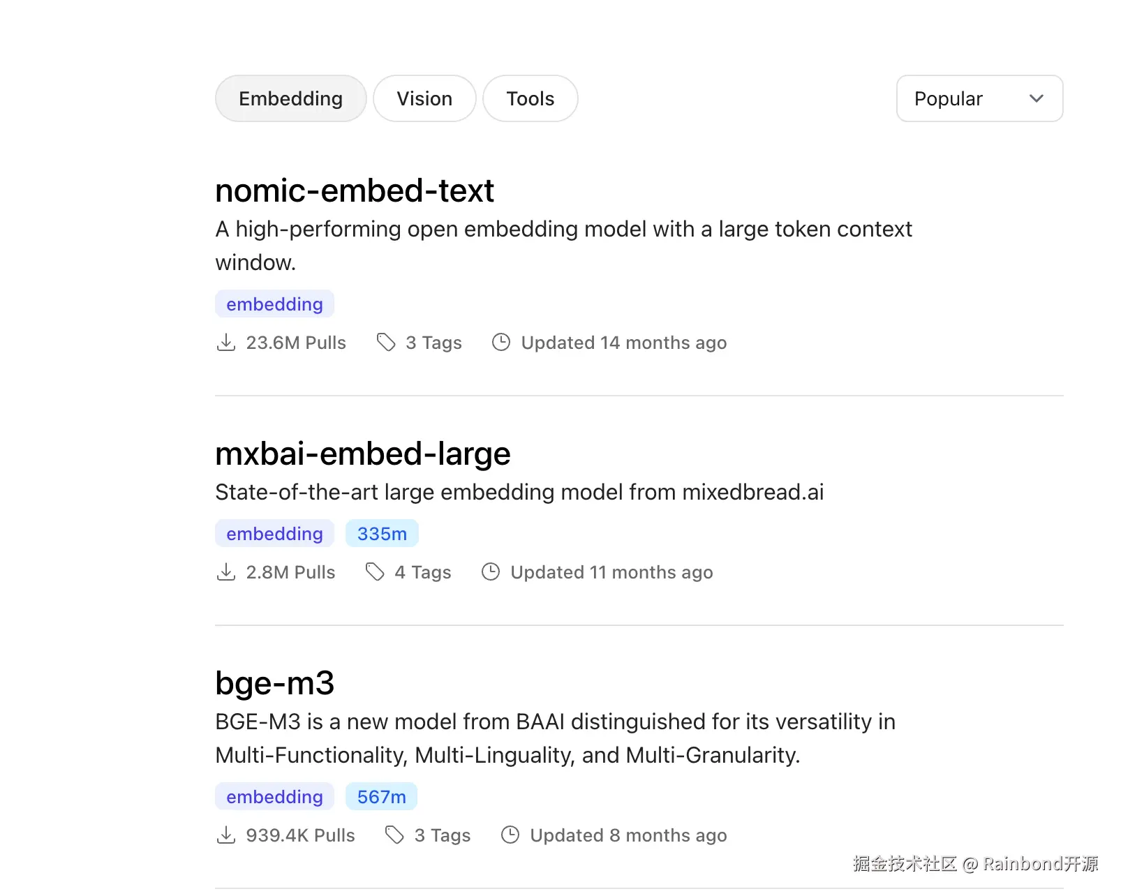 为啥选 BGE-M3?主要因为它是专为中文检索场景定制的选手,背靠中科院团队研发,天生自带中文语义理解 Buff。你也可以直接在 Ollama 里搜索其他 Embedding 模型。