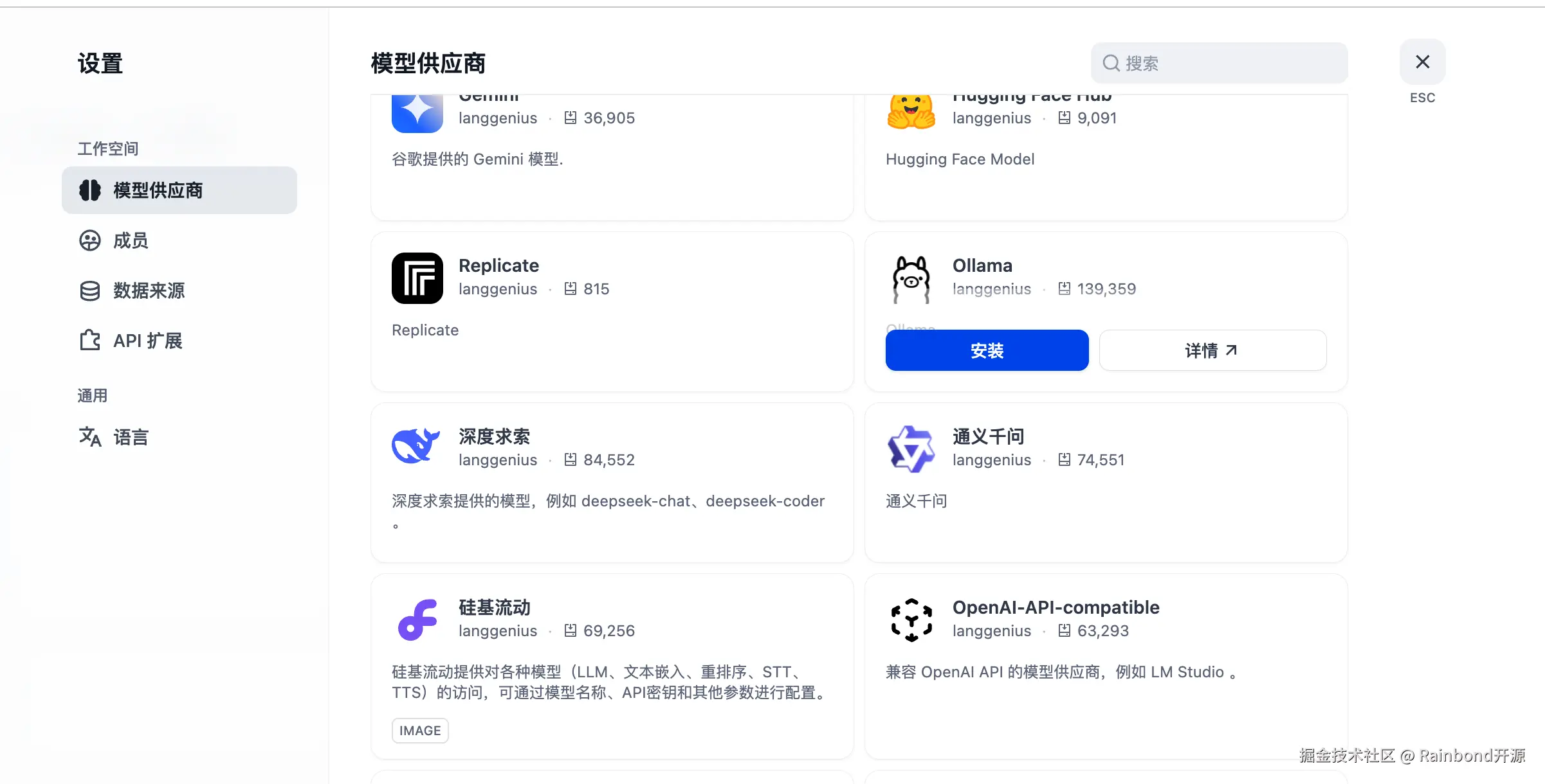 进入 Dify 页面后,点击右上角头像 -> 设置 -> 模型供应商,安装 Ollama。插件安装可能需要点时间,如未成功请再次安装。