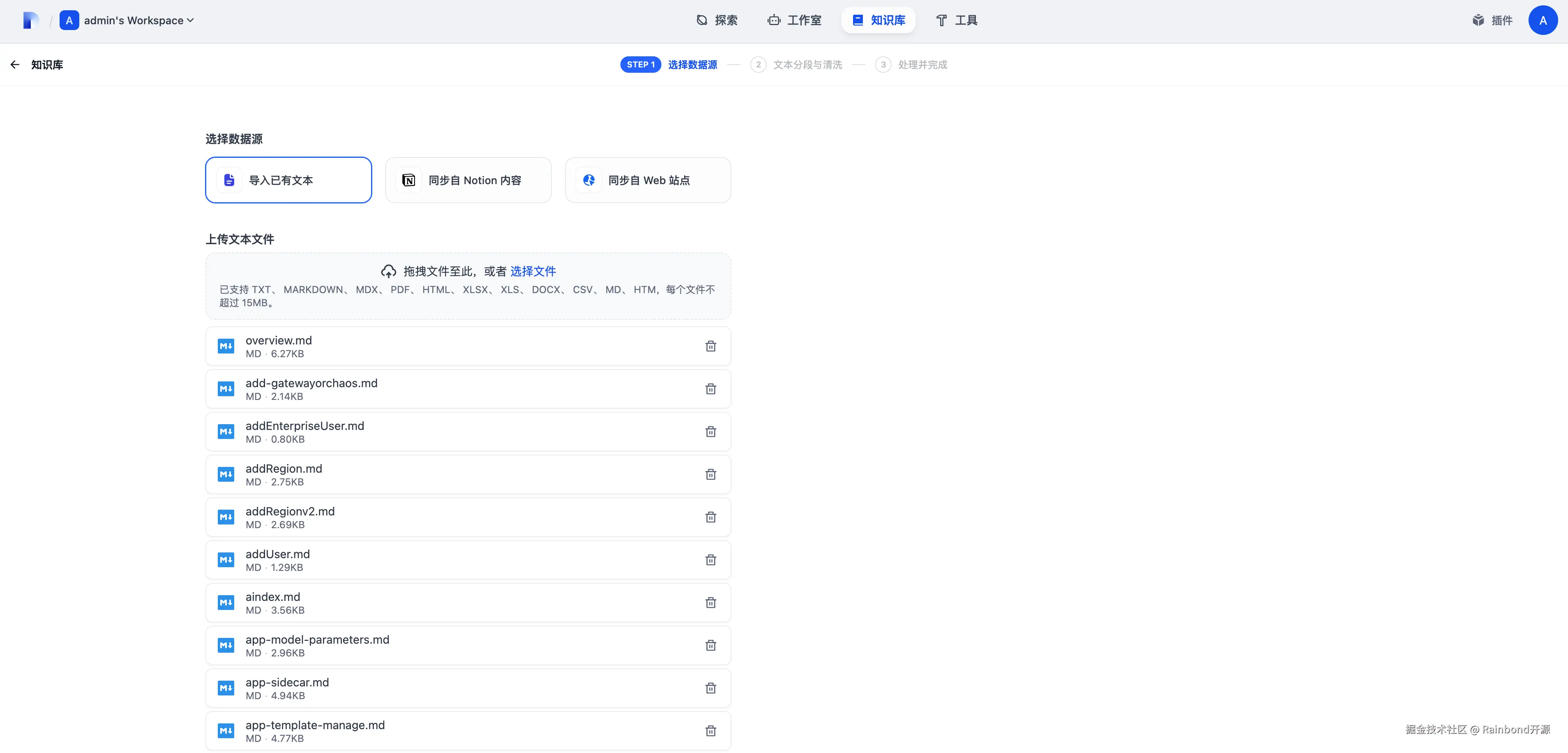 点击上方的知识库按钮,创建一个新的知识库,上传本地的文档并下一步。