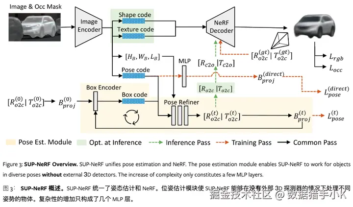 SUP-NeRF的核心创新点在于将对象的姿态估计和基于NeRF(Neural Radiance Fields,神经辐射场)的对象重建过程进行了统一。这种方法解决了单目对象重建中的尺度-深度歧义问题,提高了从单张图像中恢复对象姿态、形状和纹理的准确性。