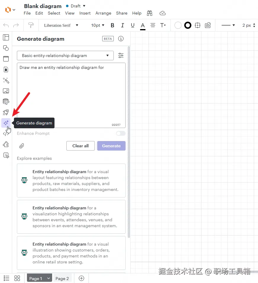 随着AI大模型和衍生的AI工具变得愈发普及,Lucidchart也在产品内引入了AI功能模块——生成图表,点击Lucidchart左侧工具栏的“Generate diagram”,打开生成图表的面板。