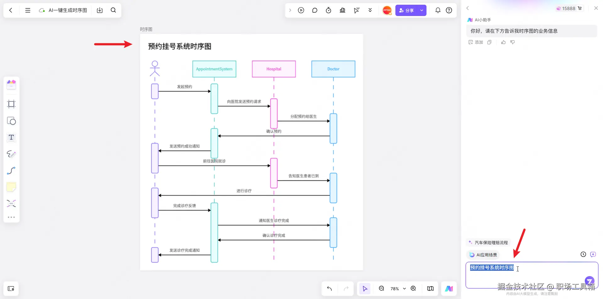 boardmix内置的AI绘图功能进一步降低了绘图的门槛,当用户输入“生成预约挂号系统时序图”时,boardmix AI会自动生成包含就诊人、预约系统、医院和医生等对象的基础架构,信息按照先后顺序在各个对象间流转。相较传统的手绘方式,AI在线生成图表简直就是降维打击,彻底重塑了办公绘图流程和体验,让每个人都能享受到AI带来的便利。