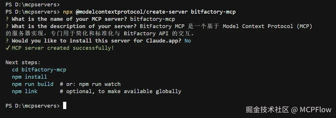 在终端执行上面命令,按照提示输入要创建的MCP服务器信息:
