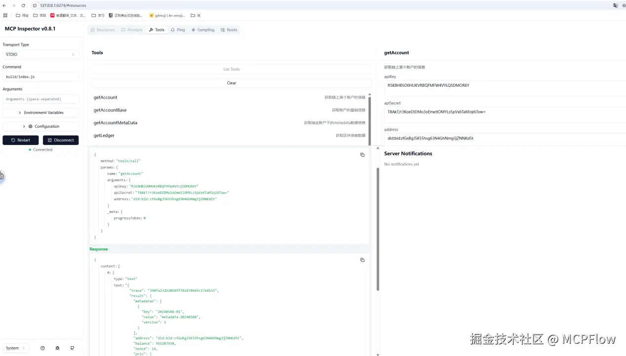 在调试工具选择 getAccount工具,填入参数,点击 Run Tool,查看工具的调用结果: