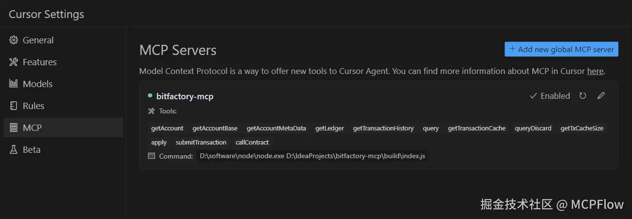 在 Cursor 的 MCP 配置面板,可以看到bitfactory-mcp 服务已经成功运行,并且获取到了可用的 Tools。