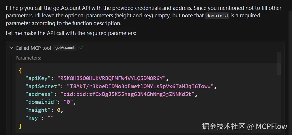 Cursor 会加载所有已配置的可用的 Tools 进行意图识别,识别到意图是获取链上账户信息,会自动调用 bitfactory-mcp 服务的 getAccount 工具。