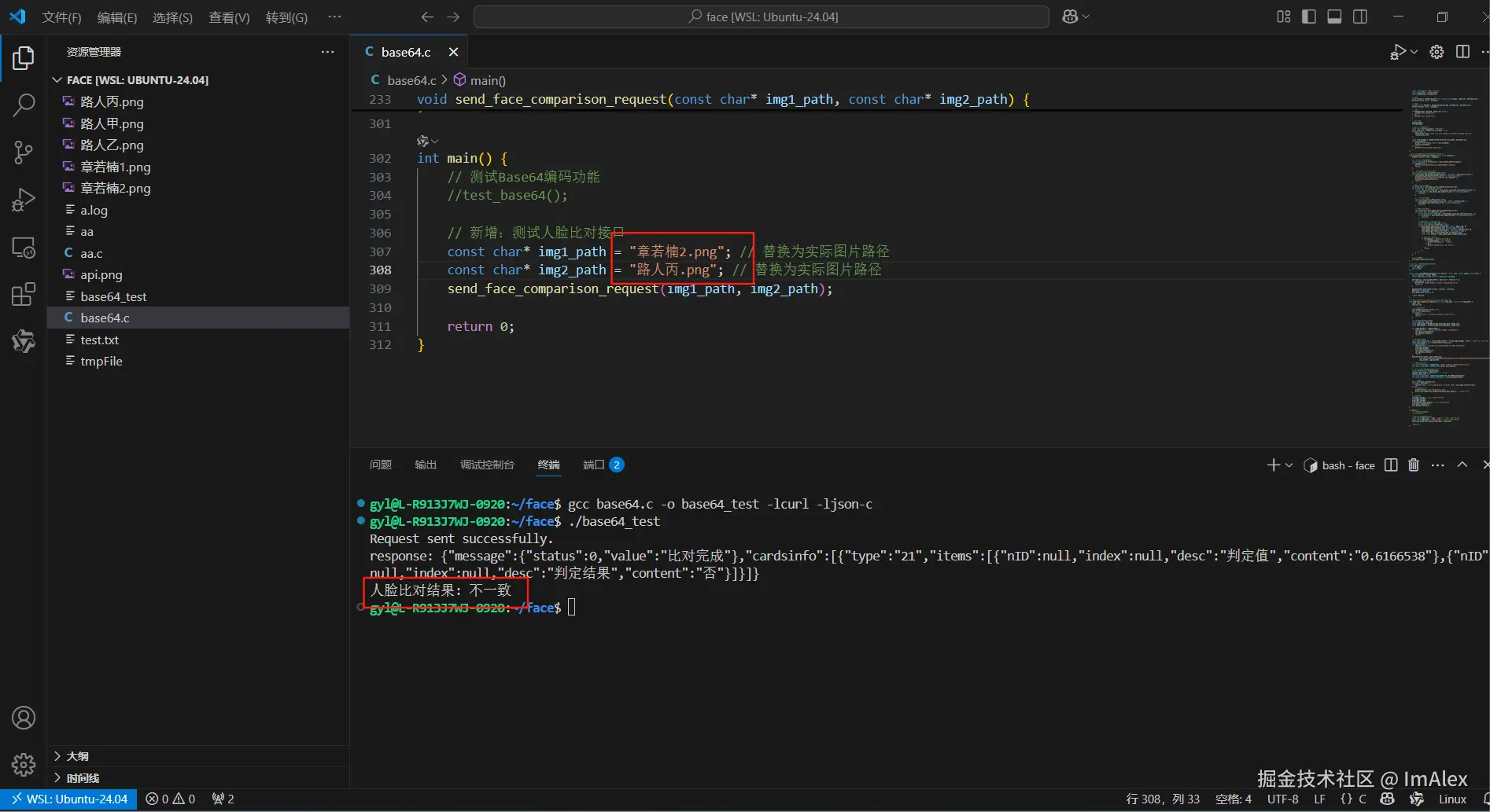 根据问题猜测,让AI程序员尝试修改一个版本,再次编译运行。使用2张同一个人的照片进行比对,成功得到结果,比对结果为一致。
