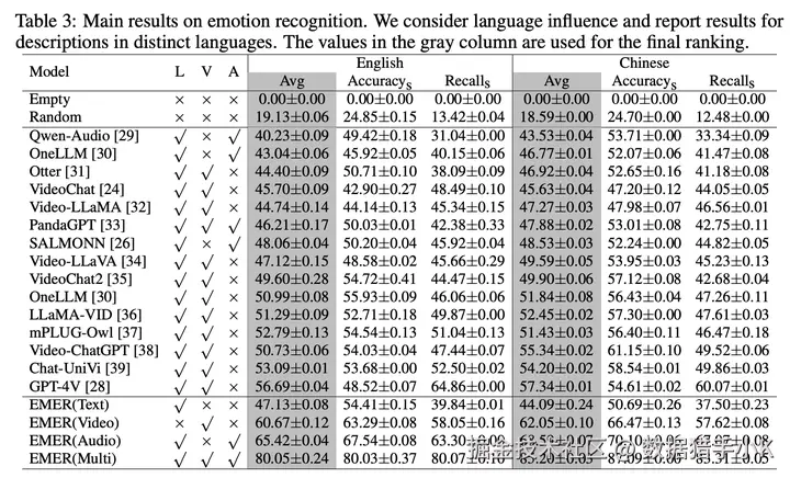 评估多模态LLM:EMER任务还可以用来评估当前多模态LLM在音频-视频-文本理解方面的能力。