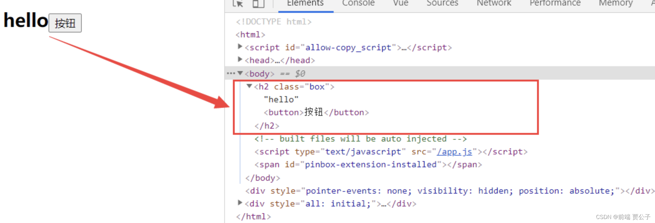 return createElement("h2",{class:"box"},['hello',createElement("button",["按钮"])])