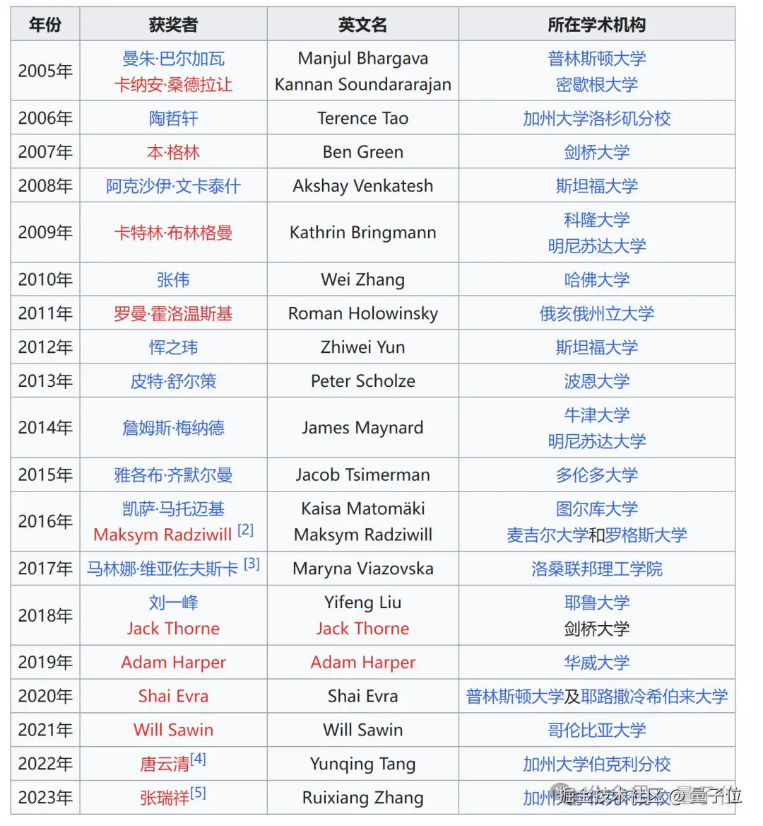 该奖自 2005 年颁发以来,至今已有 22 位获得者,包括陶哲轩、詹姆斯 · 梅纳德等多位菲尔兹奖得主,以及张伟、恽之玮、刘一峰等等出身于北大数院的数学家们。