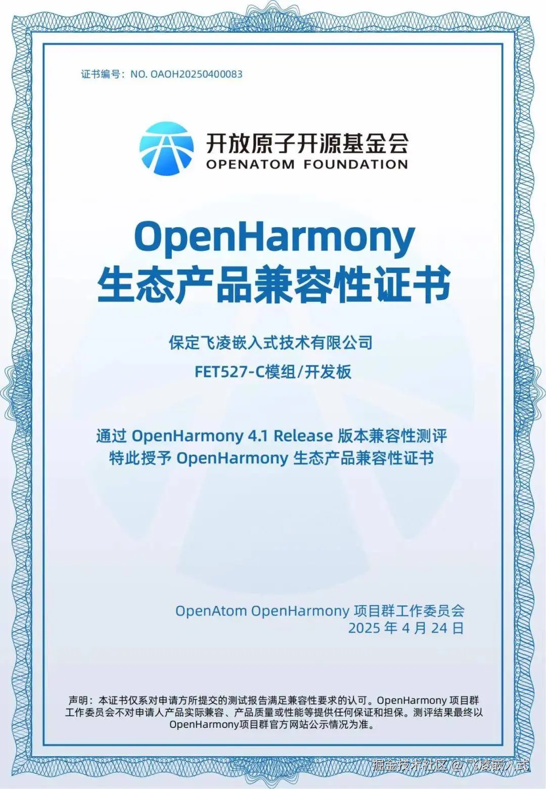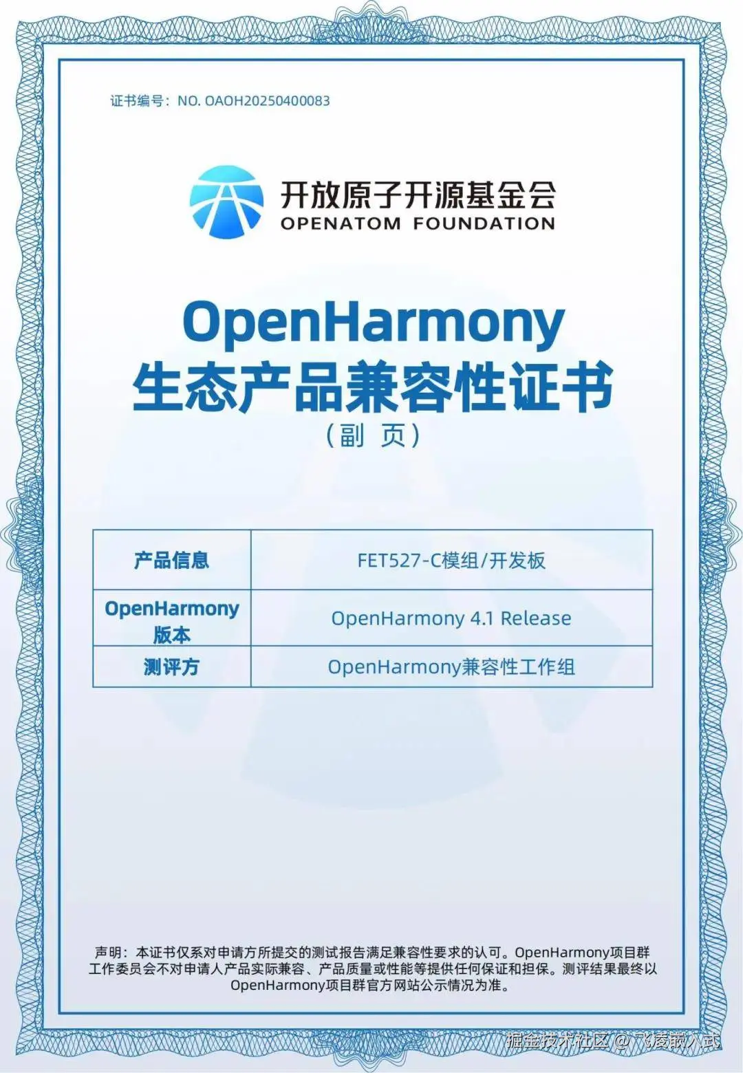 近日,飞凌嵌入式FET527-C核心板通过OpenHarmony 4.1 Release版本兼容测评,获得【OpenHarmony生态产品兼容性证书】。