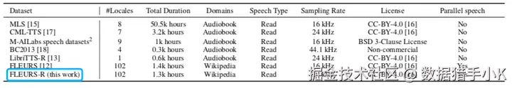 FLEURS-R ,包含102种语言的多路并行语音和文本,有助于促进多语种、跨语言和资源匮乏环境下的语音生成研究。