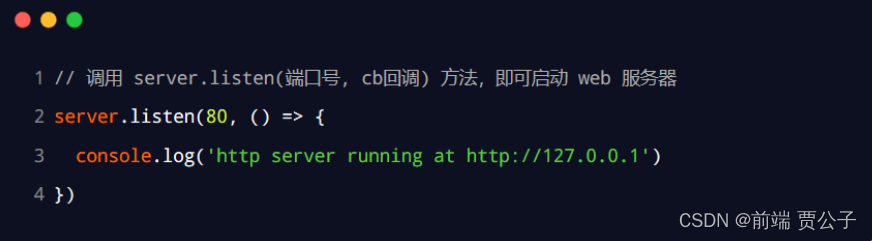 调用服务器实例的 .listen() 方法,即可启动当前的 web 服务器实例: