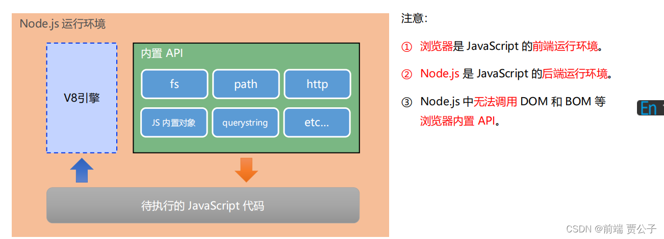 4 . Node.js 怎么学 浏览器中的 JavaScript 学习路径: JavaScript 基础语法 + 浏览器内置 API(DOM + BOM) + 第三方库(jQuery、art-template 等) Node.js 的学习路径: JavaScript 基础语法+Node.js 内置 API 模块(fs、path、http等)+第三方 API 模块(express、mysql 等)