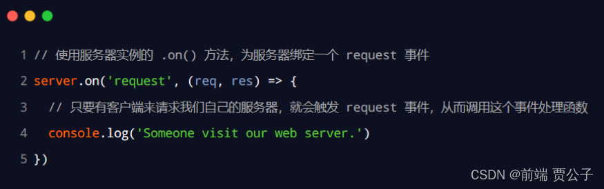 为服务器实例绑定 request 事件,即可监听客户端发送过来的网络请求: