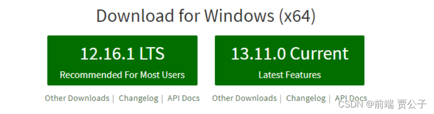 安装包可以从 Node.js 的官网首页直接下载,进入到 Node.js 的官网首页( nodejs.org/en/ ),点击 绿色的按钮,下载所需的版本后,双击直接安装即可。