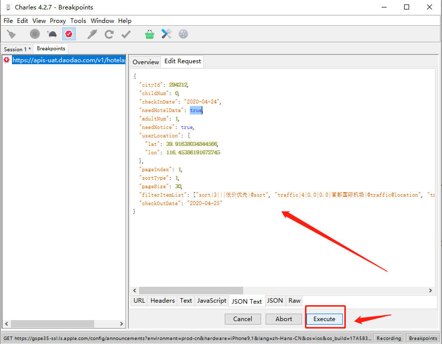 3.在终端重新发起请求,请求将会被拦截,会弹出当前页面,选择json text标签,篡改入参内容,比如讲needHotelData的数据改为false,点击execute按钮。释放请求。查看返回结果即可。