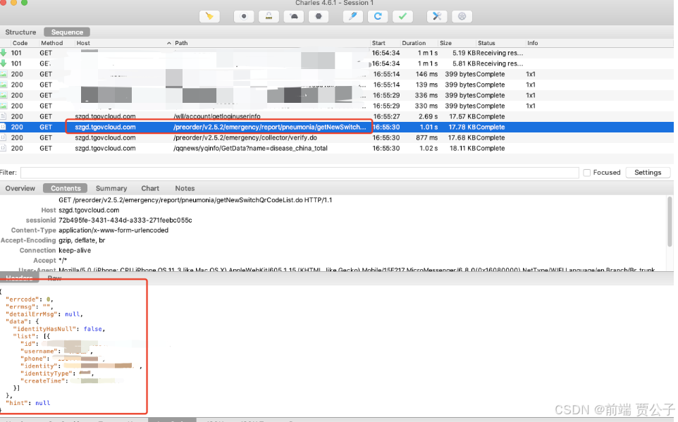 3、 在Charles界面可以查看到当前小程序的抓包情况,并可查看到接口信息;