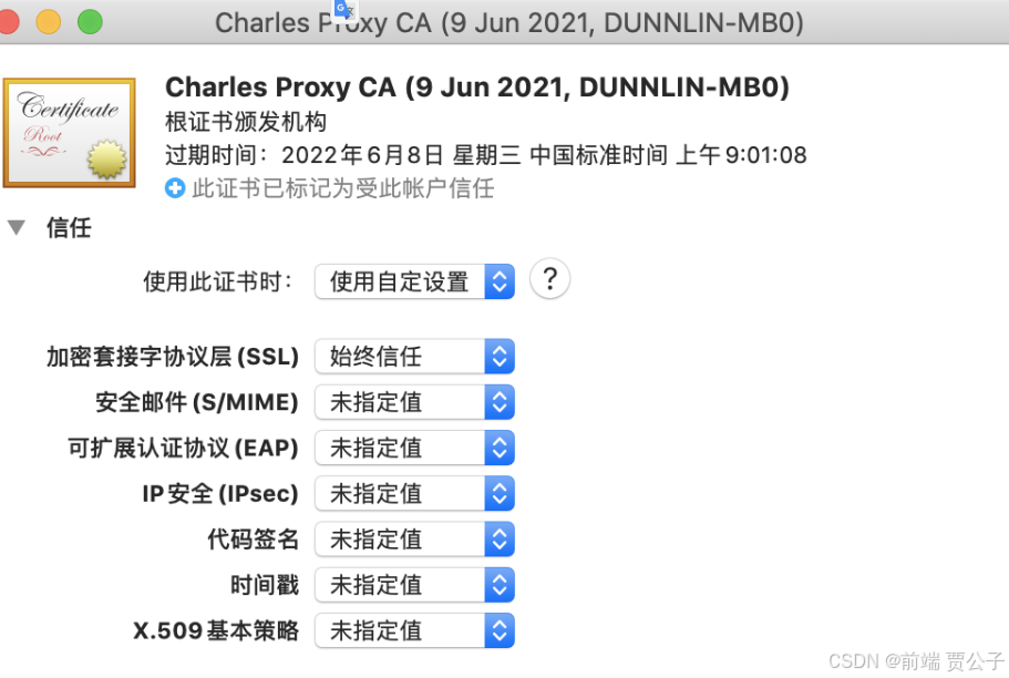 为Charles Proxy CA设置信任设置SSL始终信任;