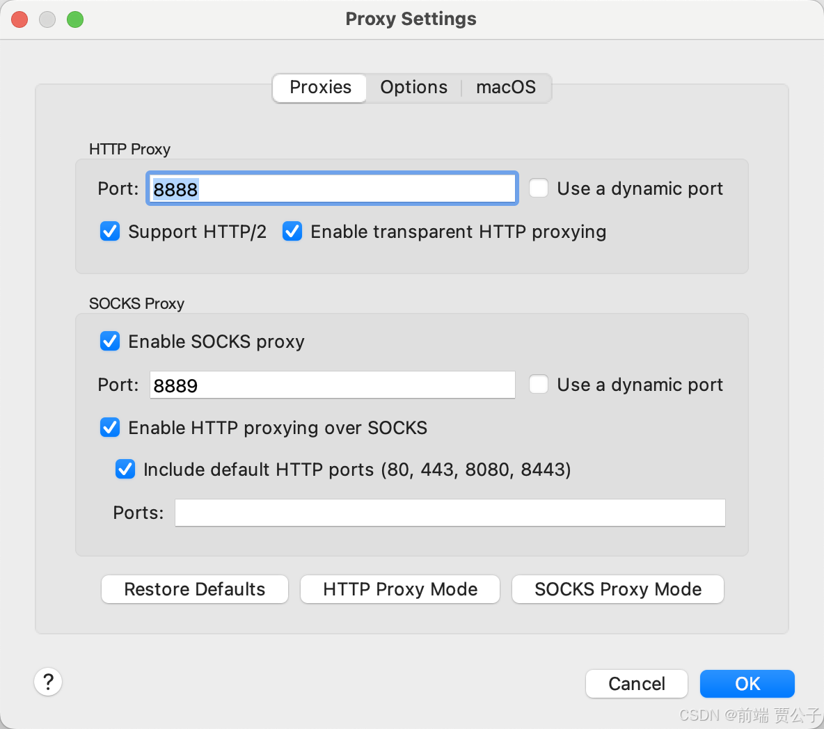 Port 端口选择8888上进行监听,勾选 SOCKS proxy 使工具能够截取到浏览器的 http 访问请求;