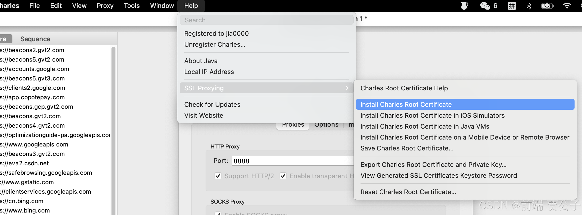 4、安装PC端根证书,点击 Help -> SSL Proxying -> Install Charies Root Certificate;