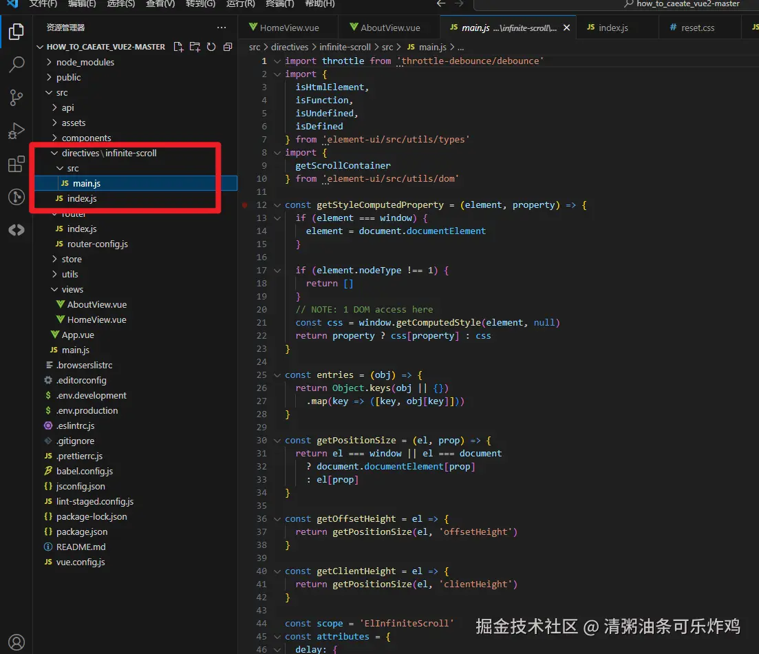因为组件内用到了一个自定义指令,所以需要把这个自定义指令的代码复制过来,在directives文件夹下,直接把我的代码(infinite-scroll整个文件夹)复制过来就行。并且在main.js上注册一下: