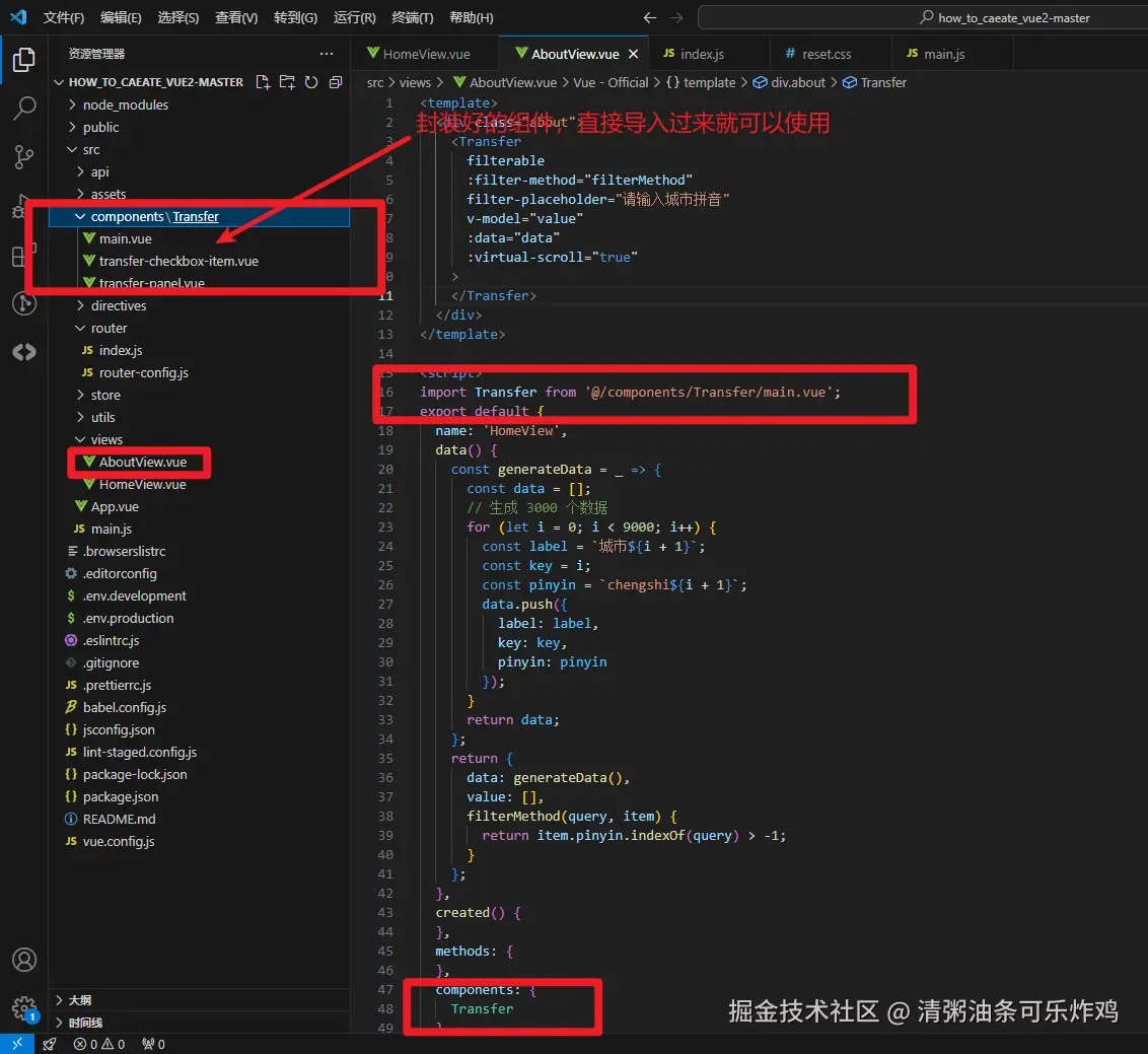 直接用Transfer替换你的el-transfer组件名就行了,并且一定要传入:virtual-scroll="true",不然跟原来的el-transfer没有区别,还是会很卡。
