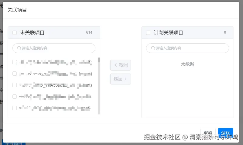 我们这个穿梭框获取的是项目的全量数据,在左边大概有5000条,自己测试了一下5000条数据的效果,发现异常的卡顿,本来打算像el-select一样去解决的(只显示一部分,在搜索的时候去全量搜索,奈何这个搜索方法不支持远程搜索,只能弃用该解决方案),一顿百度跟ai搜索,感觉答案都比较模糊,所以记录一下该解决方案。