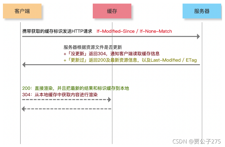 - 两次时间(标识)一致,说明服务器资源距离上一次缓存没有任何的更新,此时服务器返回304状态码即可,客户端接收到这个状态后,从本次缓存的信息中获取渲染即可