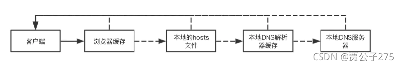 浏览器的DNS解析缓存 -> 本地HOSTS文件 -> 本地DNS解析器缓存 -> 本地DNS服务器上