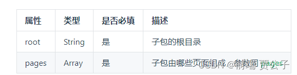 subPackages 节点接收一个数组,数组每一项都是应用的子包,其属性值如下: