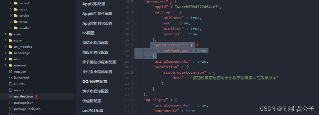 uniapp中小程序开启分包,需要在项目根目录下的manifest.json文件中开启: