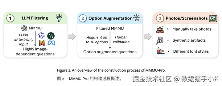 MMMU-Pro通过基于MMMU的三步过程严格评估多模态模型的真实理解和推理能力:(1)过滤掉纯文本模型可回答的问题,(2)增强候选选项,(3)引入仅视觉输入设置,其中问题嵌入图像中。这种设置挑战人工智能同时真正“看”和“读”,测试无缝整合视觉和文本信息的基本人类认知技能。